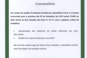 De acordo com a convocatória do dia 16 de agosto de 2019, realizou-se ontem dia 3 de setembro a Assembleia-Geral para apresentação das contas de 2017/2018 e...