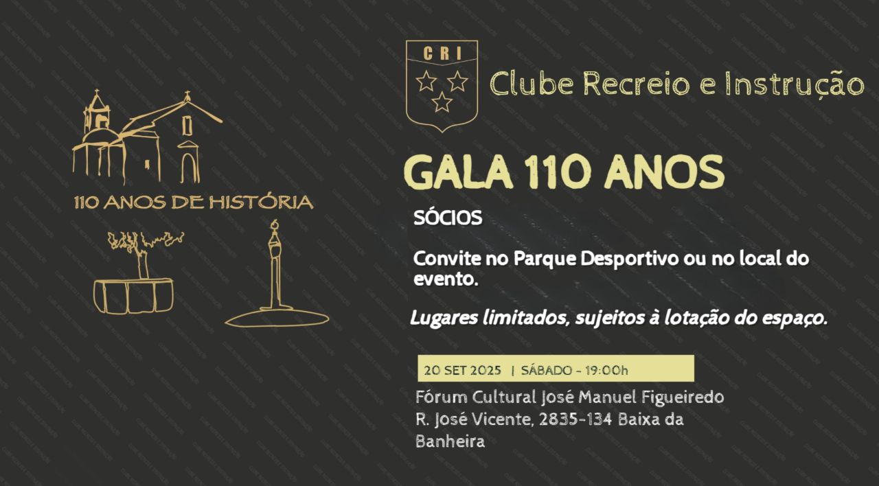 Informação GALA 110 ANOS 17 de Setembro de 2025 Aos sócios: Garanta o seu lugar! Levante previamente o Convite no Parque Desportivo ou no local do evento. Lugares limitados, sujeitos à lotação do espaço. FacebookXEmailLinkedInWhatsApp Fotos: Gala CRI 110 Anos Torneio 110 Anos CRI Um clube especial INSCRIÇÕES ABERTAS CLICAR AQUI PARA SABER MAIS RESERVAR CAMPO CLICAR AQUI PARA SABER MAISCRI Pelo Mundo CLICAR AQUI PARA VER
