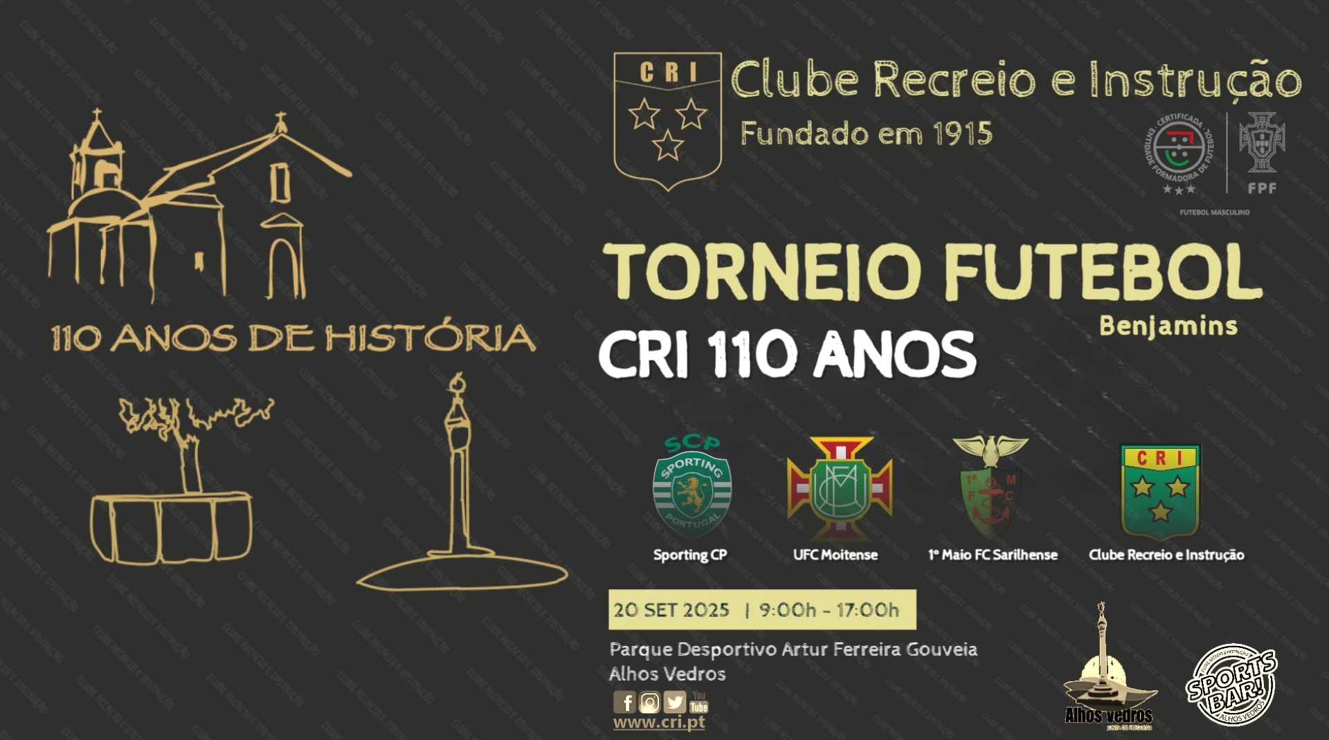 Informação Torneio 110 Anos CRI 15 de Setembro de 2025 Sábado, 20 setembro – Manhã (Benjamins A) 09h-13hSábado, 20 setembro – Tarde (Benjamins B) 15h-17h FacebookXEmailLinkedInWhatsApp GALA 110 ANOS Época 2025/26 | Horários Um clube especial INSCRIÇÕES ABERTAS CLICAR AQUI PARA SABER MAIS RESERVAR CAMPO CLICAR AQUI PARA SABER MAISCRI Pelo Mundo CLICAR AQUI PARA VER