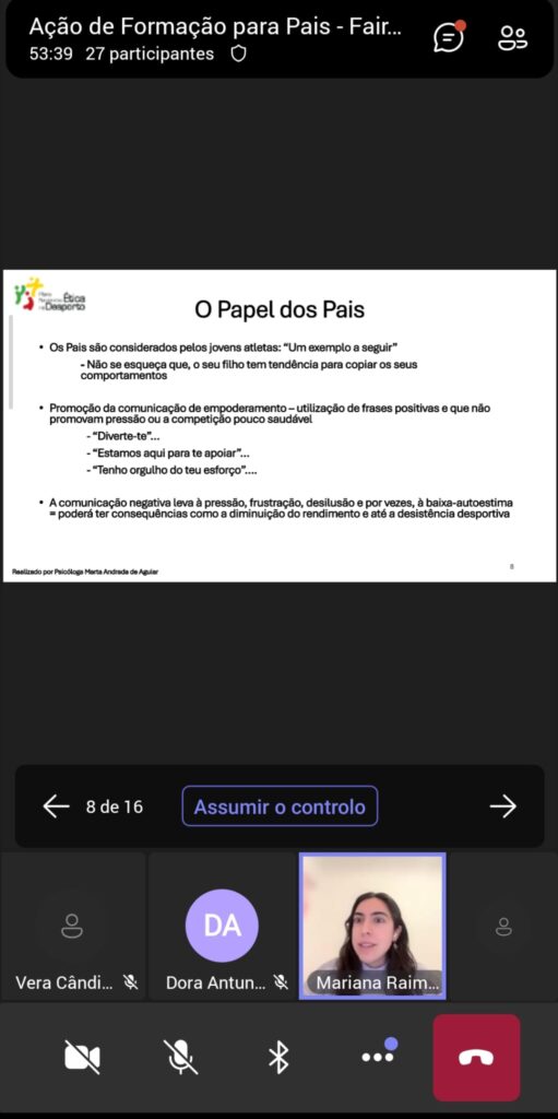 Esta sessão enquadrou-se no âmbito do Plano Nacional de Ética no Desporto e pretendeu reforçar a importância do papel da família na formação desportiva dos jovens atletas, promovendo valores como o respeito, a ética, o espírito de equipa e o fairplay, fundamentais dentro e fora de campo.