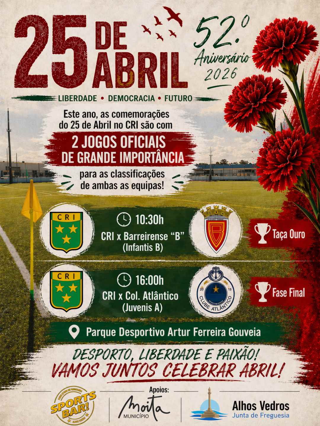 Informação Clube 25 de Abril de 2026 23 de Abril de 2026 FacebookXEmailLinkedInWhatsApp Relacionado Caminha pela liberdade com o CRI RUNNING Eventos comemorativos do 25 de abril 2018 organizados pelo CRI CRI unido na dor em homenagem à irmã de Dinis Vilão Um clube especial INSCRIÇÕES ABERTAS CLICAR AQUI PARA SABER MAIS RESERVAR CAMPO CLICAR AQUI PARA SABER MAISCRI Pelo Mundo CLICAR AQUI PARA VER